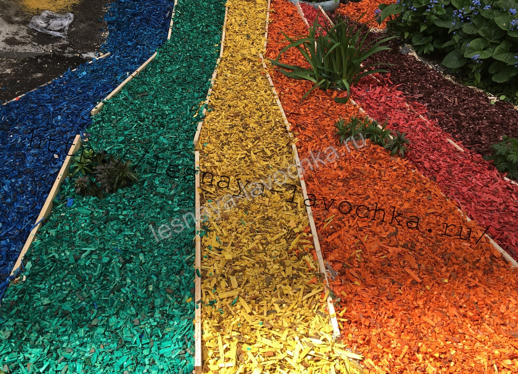 Мы производим бесцветную щепу (мульчу) и цветную щепу, в наличии имеются цвета: синий, красный, зеленый, черный, коричневый. Фасовка: мешки по 60 литров (примерно 15 кг).