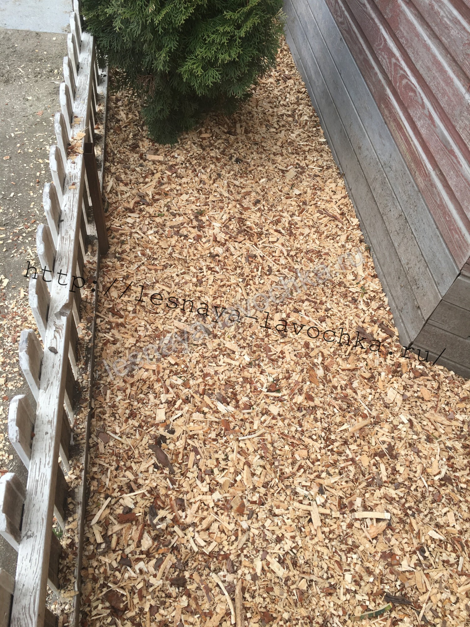 мульчу из сосны. Фракция кусочков 0.5-1.5 см., цвет: естественный, фасовка: мешки по 15 кг/ 60 литров.